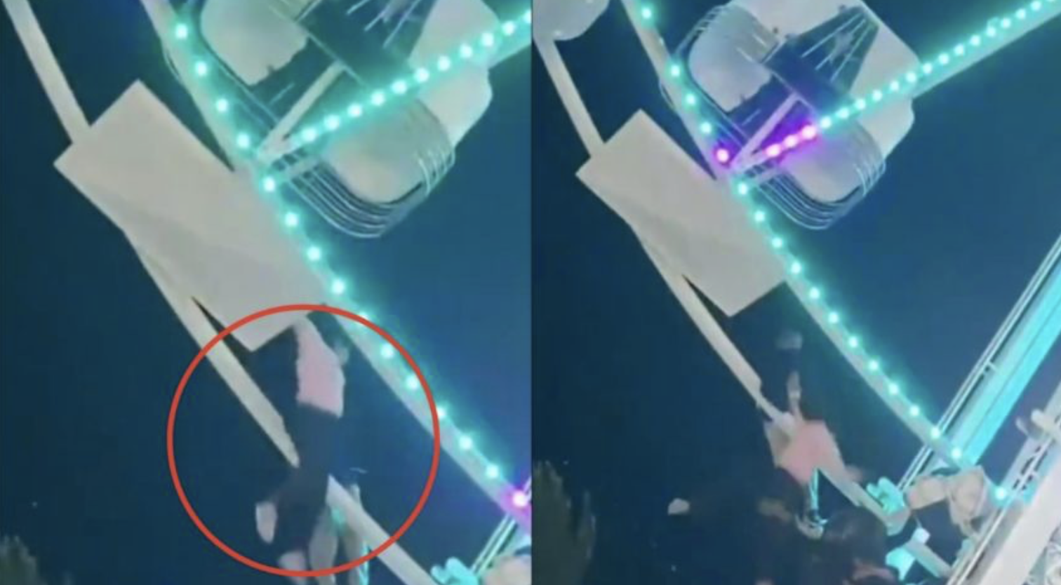 Las imágenes que circularon en internet muestran cómo la canastilla queda completamente volteada mientras la rueda de la fortuna continúa en movimiento.